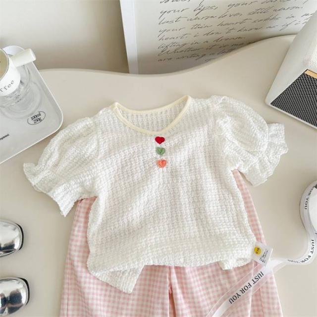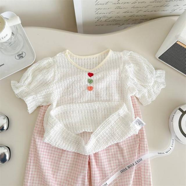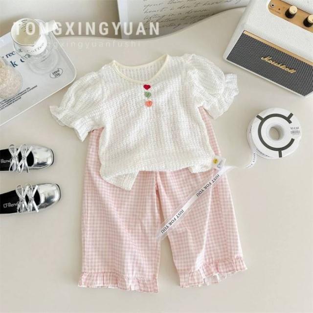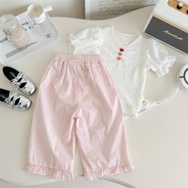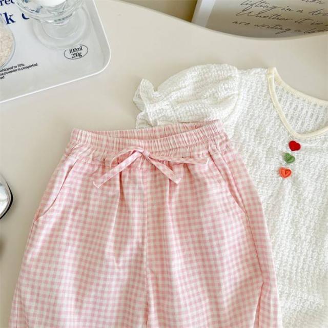 女の子 キッズ服 子供服 ベスト パンツ ピンク チェック柄 蝶結び 森ガール系 2点セット お出掛け 春夏 新作 可愛い 新品 韓国風 1-6歳
