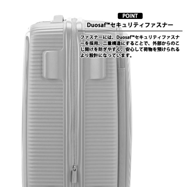 ブックオープンで荷造りがしやすいミドルサイズ。OPTIMOVサスペンション搭載の静音キャスターが振動を抑え、エキスパンダブルで容量を約91Lまで拡張可能。DuosafセキュリティファスナーとTSAロックで旅先でも安心です。4〜6泊程度の旅行や帰省に活躍します。