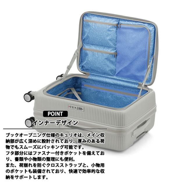 POINT:ブックオープン/小物ポケット/クロスストラップ/OPTIMOV静音キャスター/Duosafファスナー/拡張機能
