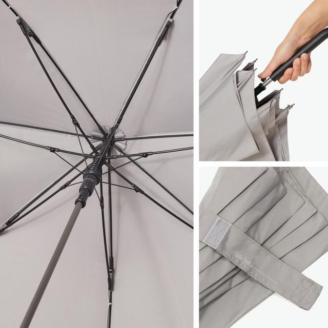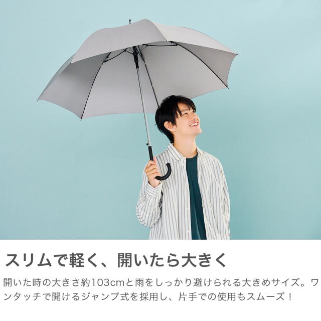 大きめ65cmなのに、スリム&軽量設計の耐風傘。特殊ダボがサスペンションのようにしなり、風を受けてもひっくり返りにくい構造です。ワンタッチで開くジャンプ式に、傘をまとめやすいように太めのバンド付き。UVカット率90%以上なので、雨の日も晴れの日も頼れる1本です。