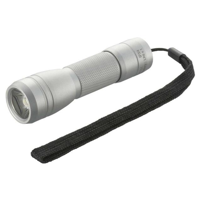 明るさ80ルーメン、連続使用時間約6時間、保護等級IPX4、照射距離約60m、携帯ストラップ付き、アルミボディ