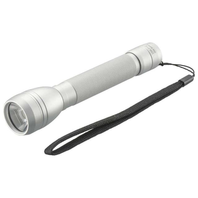明るさ220ルーメン、連続使用時間約7時間、保護等級IPX4、照射距離約120m、携帯ストラップ付き、アルミボディ