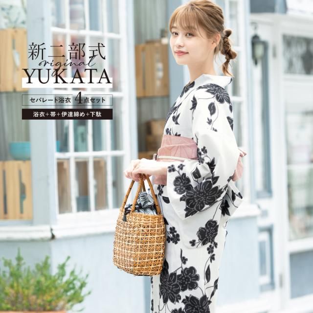 ※新二部式浴衣(上衣+下衣+おはしょり布)・帯・伊達締め・下駄の4点セットです。セット内容の一部変更や、それに伴う値引きは承っておりません。