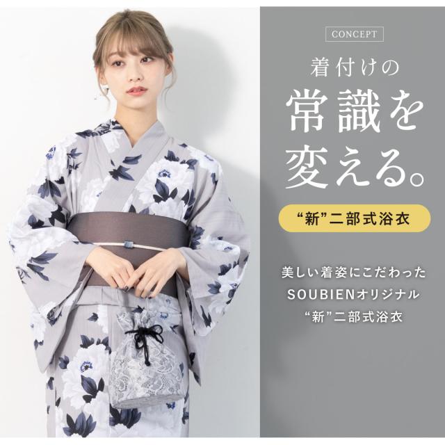 ※新二部式浴衣(上衣+下衣+おはしょり布)・帯・伊達締め・下駄の4点セットです。セット内容の一部変更や、それに伴う値引きは承っておりません。