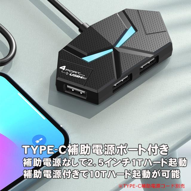 | 電源不要で本体に挿すだけで簡単USB口増設 USBポートを増設する事で、マウスやキーボードなどの 複数同時使用が可能で接続可能 USB2.0/USB1.1対応の機器 4ポートタイプと7ポート対応がご選択頂け ケーブルの長さは60cm/1.2mがご選択頂けます。 USBに接続でLEDが点灯 アプリやドライバーのインストールは必要なく、デバイスに挿すだけでお使い頂けます。 TYPE-C端子の補助電源ポート付き 補助電源を接続する事で10Tハード起動が可能 補助電源なしの場合は2.5インチ1Tハードまで |
