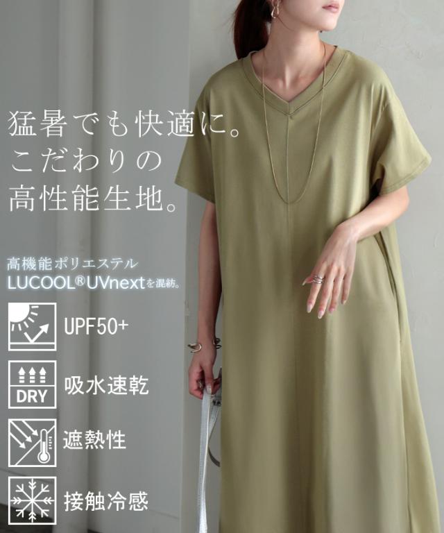 ワンピース Tシャツ 接触冷感 UVカット 選べる2丈 ロング ワンピ レディース 吸水 速乾 遮熱性 ロングワンピース カットソー Aライン マキシ シワになりにくい ワンピ ロングワンピ 半袖 体型カバー 綿 混 大きいサイズ無地 黒 白 春 夏 HUG.U