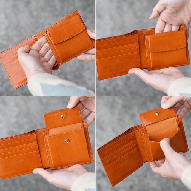 クラシックなオープンタイプで、留め金具がなくダイレクトかつスムーズに中身を出し入れできて便利です。紙幣の分類ができる、2箇所の札入れスペース。小銭入れは、スナップボタン式のマチありポケット。カード収納は、実質7枚分。左側の4箇所に加えて、左右のサイドポケットと小銭入れの後ろにある隠しポケットも利用できます。長財布と比べてかさばらないサイズで使い勝手のいい二つ折り財布です。