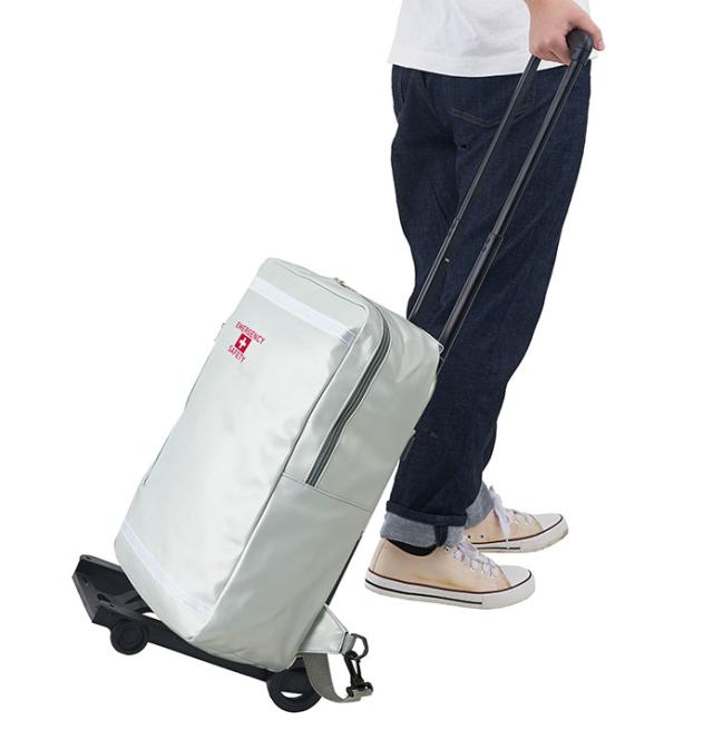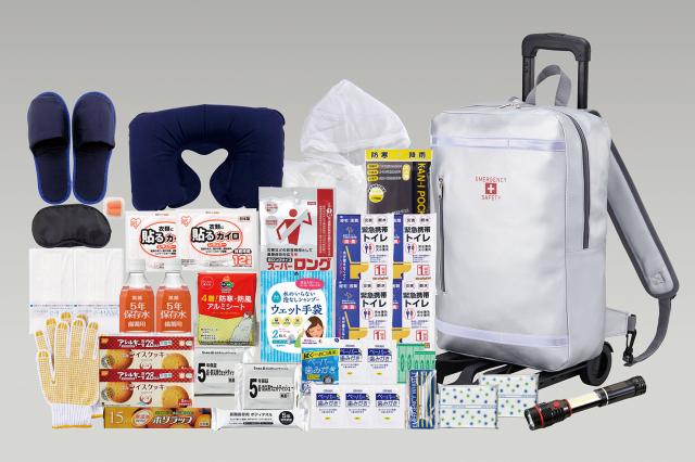 セット内容:避難用リュックバッグ、キャリーカート、COB伸縮2WAYライト、ホイッスル、携帯トイレ(大小兼用)1P×4、防寒アルミシート、ウェットティッシュ(20枚)×2、軍手、使い捨てカイロ×2、レインコート、エイトバン(大小×各2)、ポケットティッシュ×2、ペーパー歯磨き(5包)、シャンプー手袋、ウェットボディタオル、マスク×2、スリッパ、首枕、アイマスク、耳栓、ラップ、備蓄用飲料水(500ml)×2、ライスクッキー×2、長期保存ボディタオル