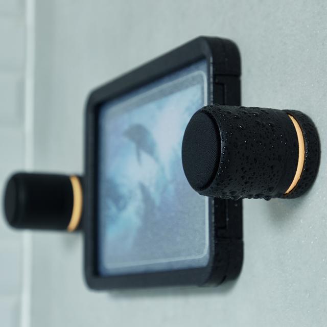独立した左右2つのスピーカーを採用することで、立体感のあるサウンドを実現し、どこでも臨場感あるシアター空間に早変わりするステレオの防水ポータブルシアタースピーカーです。スピーカー底面部にはマグネットを搭載。充電スタンドにスマートに取り付けられ、簡単に充電可能です。ユニットバスの壁や冷蔵庫などに貼り付けて楽しむこともできます。さまざまなシーンでくつろぎの時間をお過ごしください。