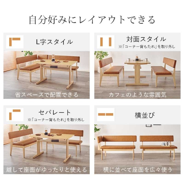お部屋を広く見せるロータイプ設計。 お部屋に合わせてレイアウトの変更ができ、天然木のシルエットと高級感のあるベンチシートがリビングダイニングのくつろぎ空間を演出。 ■サイズ テーブル:(約)幅110×奥行70×高さ65cm 2Pタイプ:(約)幅115×奥行54×高さ74×座面高41cm コーナータイプ:(約)幅123×奥行54×高さ74×座面高41cm ■素材 主材:ラバーウッド集成材、天板:天然木化粧繊維板(オーク突板)、張地:合成皮革 ■組立 お客様組立品 ■生産地 ベトナム製 ※お客様組立て品につきましては、組み立て後に不良の連絡をされても対応ができません。組み立て前にパーツに不良・傷等がないか、必ずご確認下さいますようよろしくお願い申し上げます。 ※記載は商品仕様の一部です。仕様説明不足等の理由での返品はできません。特に適合等は必ずご確認ください。