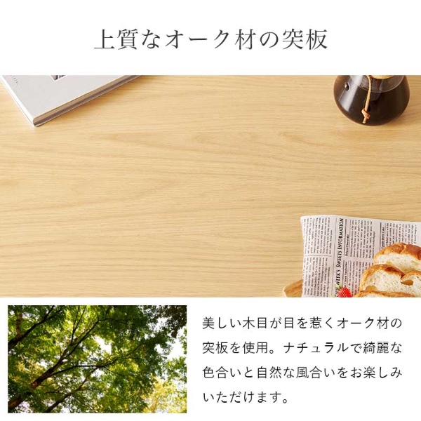 主材:ラバーウッド集成材、天板:天然木化粧繊維板(オーク突板)、張地:合成皮革