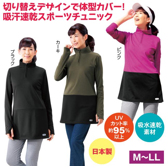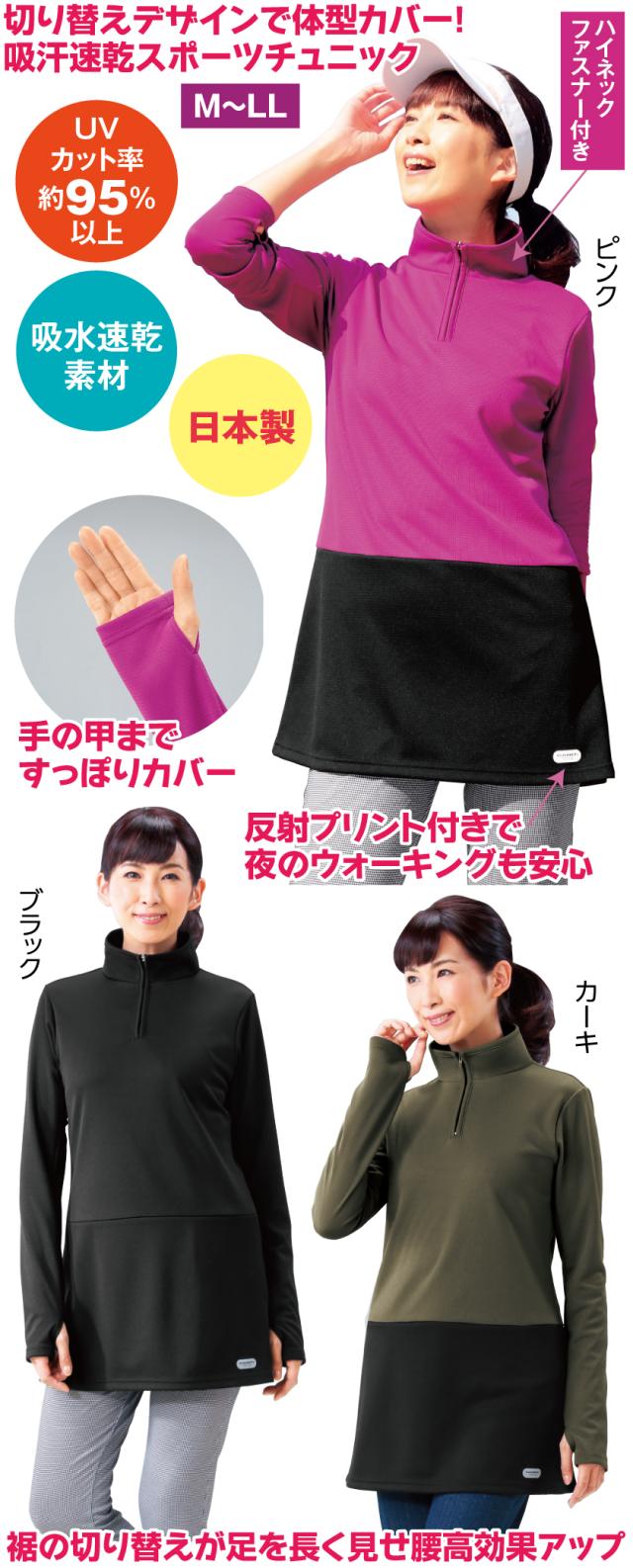 吸汗速乾 スポーツチュニック レディース チュニック 長袖 ハイネック 日本製 スポーツウェア 体型カバー ポリエステル100% UVカット 乾きやすい 反射プリント カジュアル 婦人服 ミセス シニア ゆったり 春夏 Mサイズ Lサイズ LLサイズ ブラック カーキ ピンク ゴルフ ウォーキング テニス フィットネス リハビリ 指穴付き ファスナー付き ストレッチ素材 快適ウェア 洗濯機OK 軽量素材 おしゃれデザイン ジャージ素材
