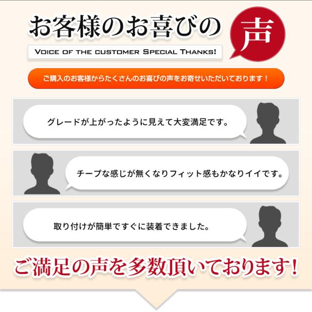 ■両面テープの配置は変更になる場合がございます。予めご了承ください。 ■仮合わせの際、万が一カバーの端などが浮いてしまう場合は別途両面テープを追加して補強してください。 ■ 両面テープを剥がした後は、いかなる理由でも返品交換対応はできません。 ■取付前には必ず仮合わせを行い、貼り付け位置をしっかり確認してからお取付けくださいますようお願い致します。 ■本品またはご使用の際の塗装ハゲ、キズ、へこみ などに対する保証一切はございません。 保証は製品のみであり、いかなる場合に於いても怪我、工賃の保証、負担は致しかねます。 ご使用は自己責任にてお願いいたします。 |