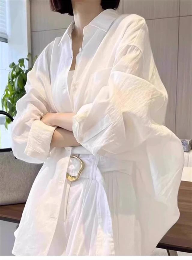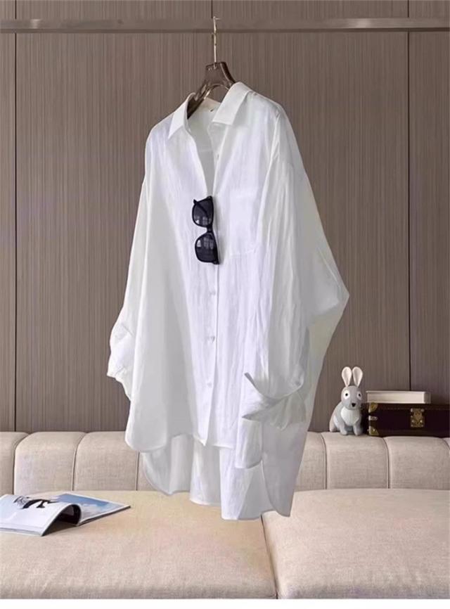 シアーシャツ レディース 夏 長袖 シースルー 大人 日焼け対策 uv対策 体型カバー 薄手 シアー トップス ボタン タレ感 前開き 微透け 透け感 ゆったり カジュアル シャツ ブラウス ホワイト 白 dh070x1x1x7 dh070x1