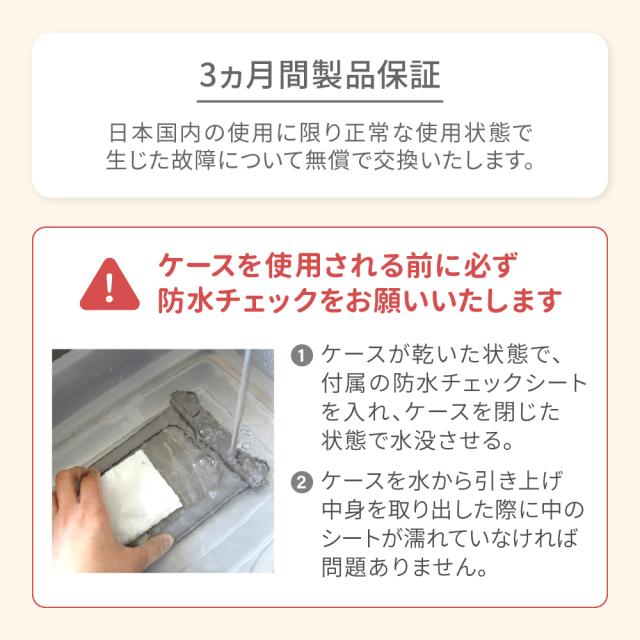 ※本製品は簡易防水を目的に作られております。防水チェック前の水中での使用、水上および水中スポーツでの使用は絶対におやめください。