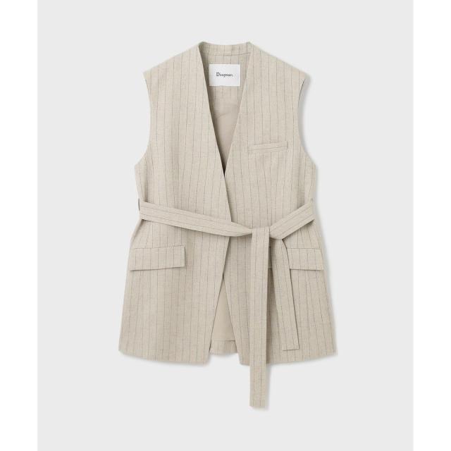 メンズライクなピンストライプ素材でお作りしたノーカラージレ。 ざっくりとしたナチュラルな表情がありつつ、カジュアル過ぎないリネンタッチな生地を使用した、大人な雰囲気のある一枚です。ノーカラーのスマートなディティールに、長めの着丈ですっきりシャープな雰囲気を楽しめるデザインに。取り外せるベルトでウエストマークすればロングスカートでもバランス良く着ていただけ、取るとバックスタイルは深いベンツ開きになっているため、夏でも涼しくさらっと着ていただけます。Tシャツなどでデイリーにお楽しみいただくのはもちろんのこと、お揃いのショートパンツと合わせることで手軽におしゃれなセットアップスタイルもお楽しみいただけます。