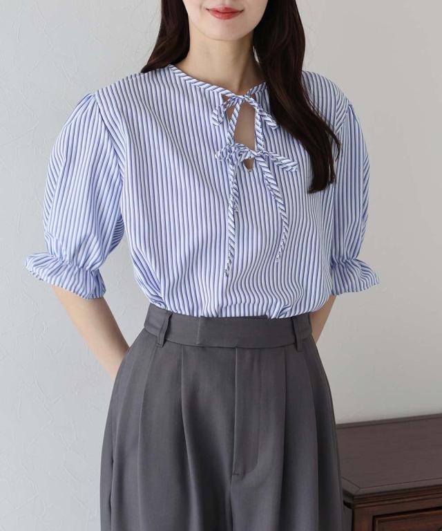 大人っぽいシンプルなストライプシャツで大人な爽やかさを演出し、胸元のダブルリボンとキャンディスリーブでキュートさをプラス。