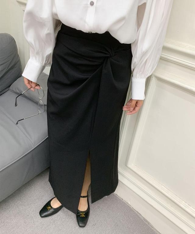 上品なフロントスリット入りロングスカート。アシンメトリーなウエスト絞りのデザインが立体感をプラスし、女性らしいシルエットを引き立ててくれます。