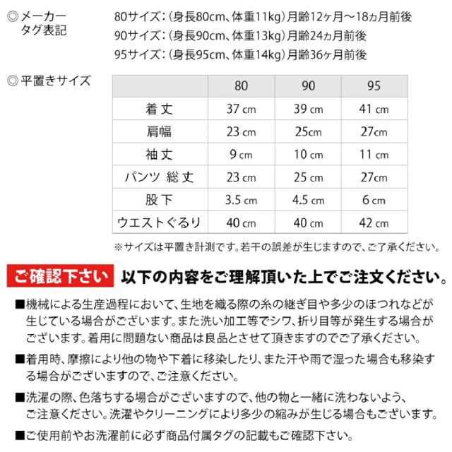 | サイズ | 80サイズ:(身長80cm、体重11kg) 90サイズ:(身長90cm、体重13kg) 95サイズ:(身長95cm、体重14kg) |