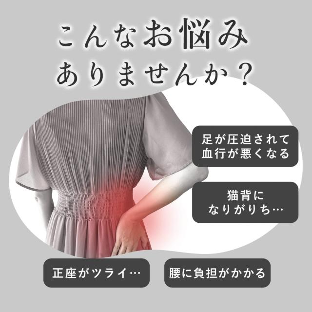 座面の前後に高低差をつけることで、自然と骨盤が立ち、美しい姿勢を保つことができるよう設計されています。通常の椅子や座椅子では、長時間座ると姿勢が崩れがちですが、このチェアならしっかりとした座り心地を提供し、腰や背中への負担を軽減します。デスクワークやテレワーク、読書や趣味の時間など、長時間の使用でも快適に過ごせます。