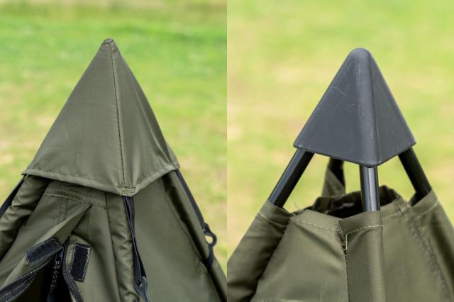 背面のファスナーの下はメッシュ素材のため通気性が抜群。屋根の尖った部分はテント内の暖まった空気を上部から排出する「トップベンチレーション」を採用しており、室内の空気を循環させながら快適さを保ちます。