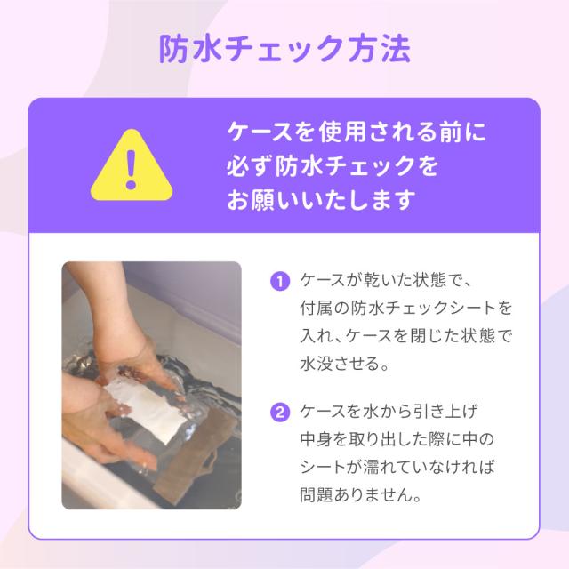 ※本製品は簡易防水を目的に作られております。防水チェック前の水中での使用、水上および水中スポーツでの使用は絶対におやめください。