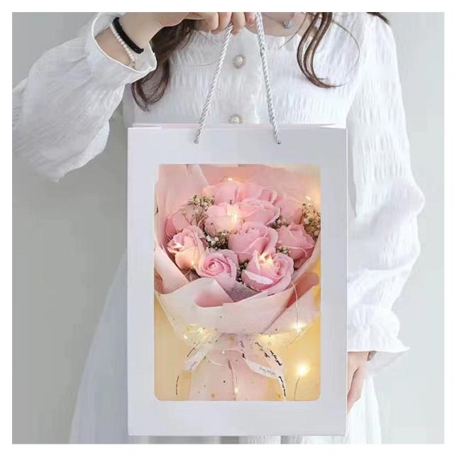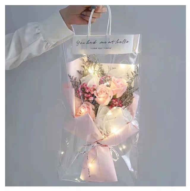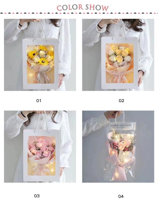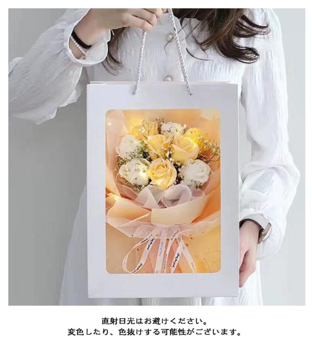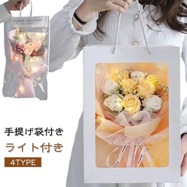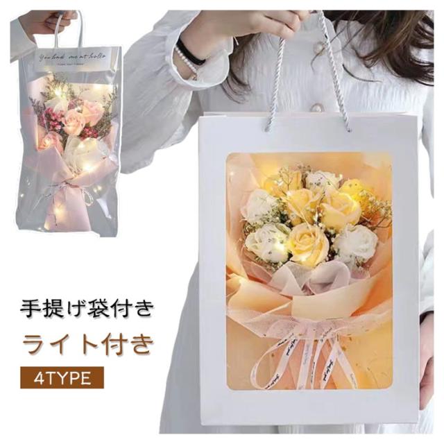 | 【4TYPE】【ライト付き】【手提げ袋付き】 〜そのまま飾れる枯れない花束〜【ソープフラワー×ドライフラワー】 花粉や毒がないのでアレルギーの方やペットと暮らしている方にも安心して贈れます。 生花でないので枯れることなく、水替えなどのお手入れが不要です。 直射日光はお避けください。変色したり、色抜けする可能性がございます。 | |