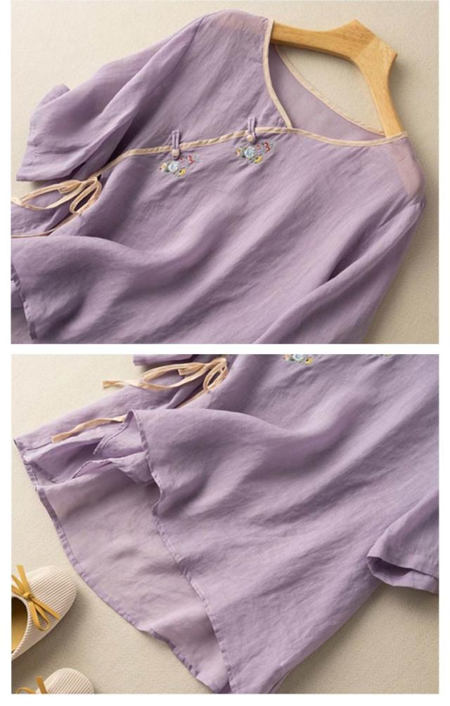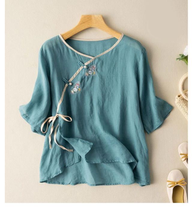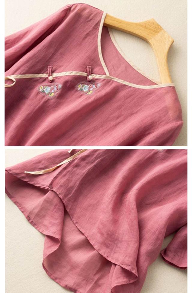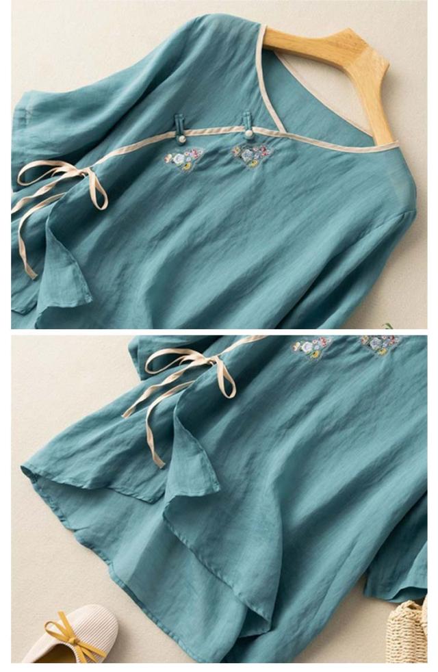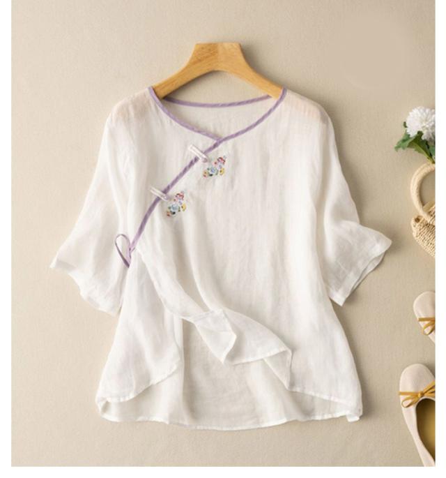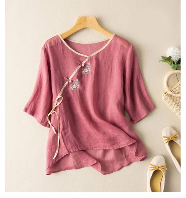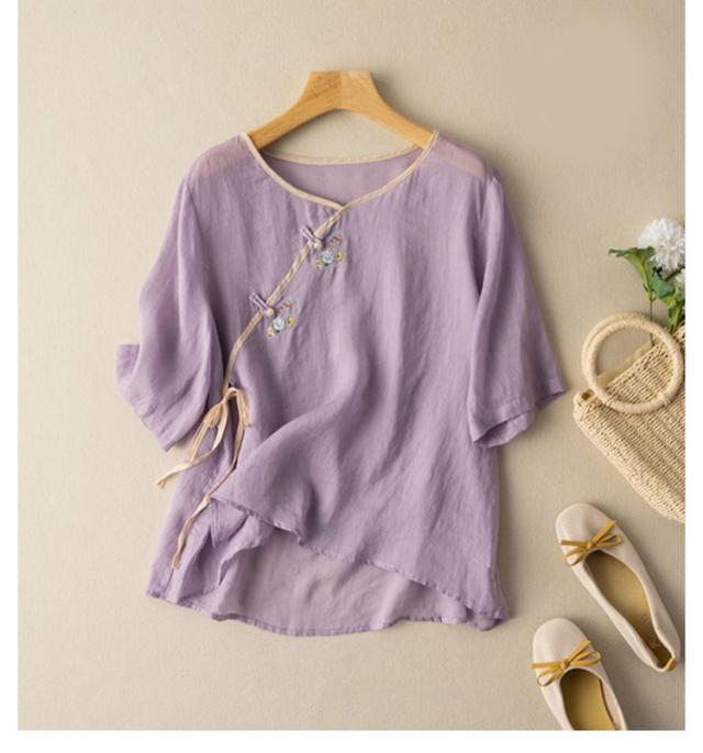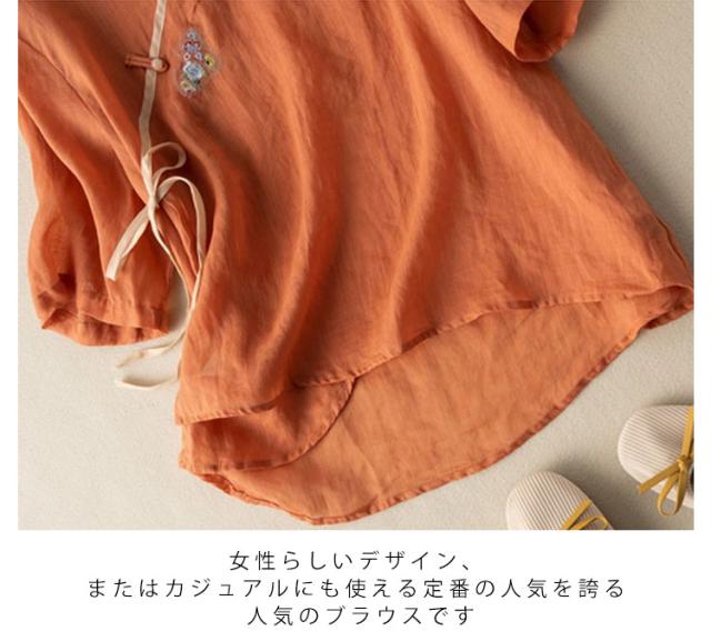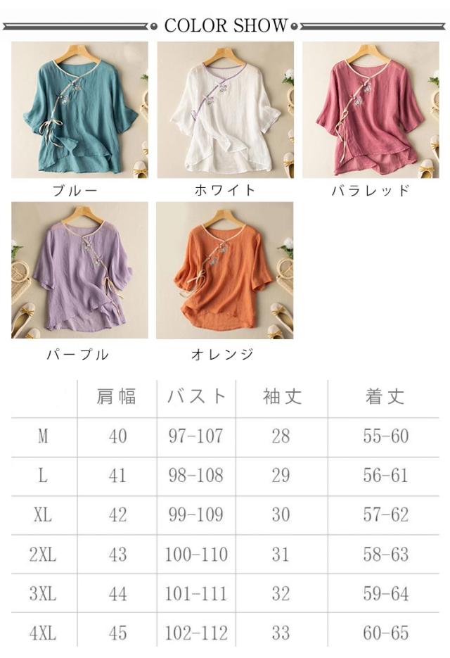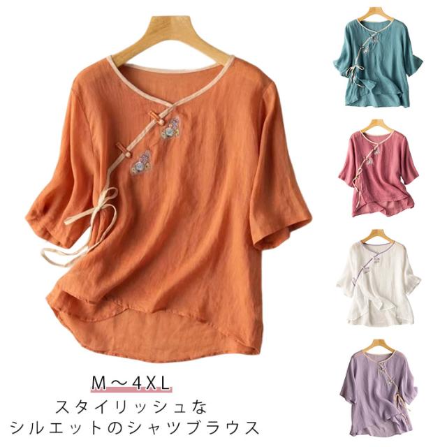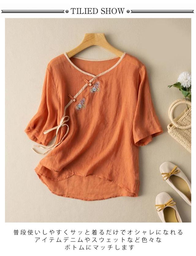春夏 ブラウス ブラウス レディース カジュアル 綿混 薄手 夏服 涼しい チャイナボタン トップス エスニック風 民族風 きれいめ シンプル 7分袖 レトロ 大きいサイズ 大人 女性 春秋 トップス Tシャツ ゆったり チャイナボタン 花柄