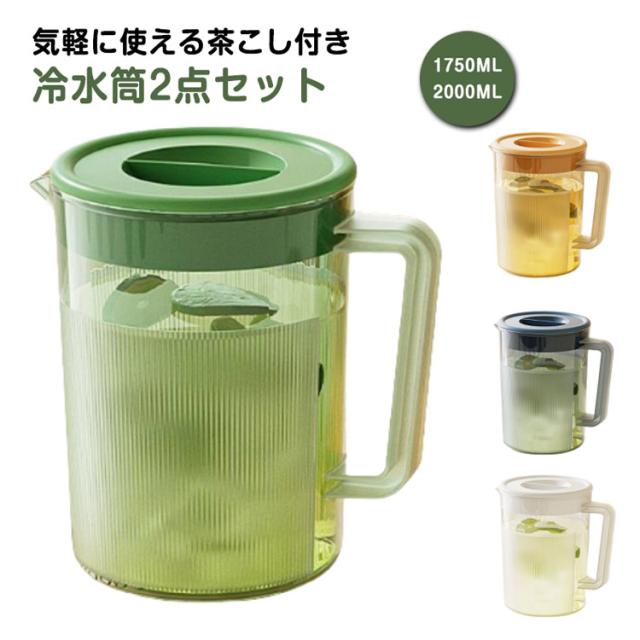 | 気軽に使える茶こし付き冷水筒2点セット 食卓で邪魔にならないシンプルでおしゃれなデザインです。 軽くて割れにくいため、気軽に普段使いしやすいのもうれしいアイテムです。 ファミリーに楽しめる2Lの大容量! シンプル構造でパーツが少なく、広口で奥まで手が入るので、お手入れ簡単にもうれしいポイント。 暑い季節には水出しアイスコーヒーやお茶などでのご利用も大変便利です。 | |