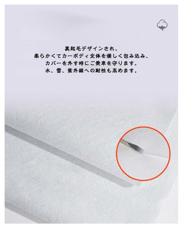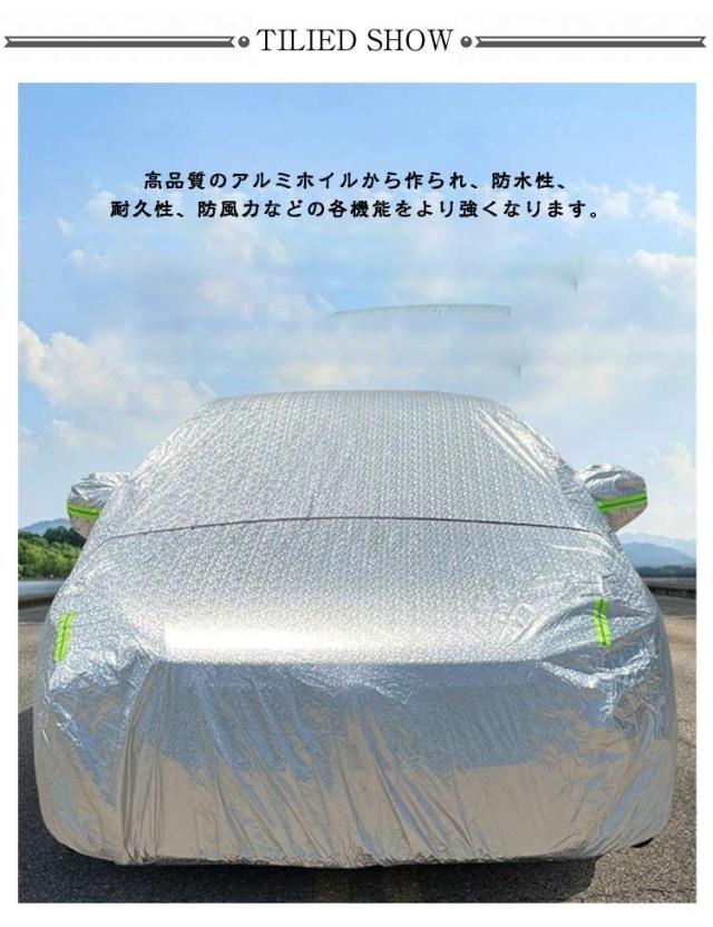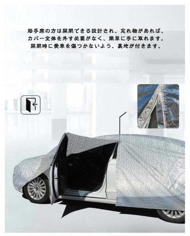 | 裏起毛で車に優しい 自動車ボディーカバー。 高品質のアルミホイルから作られ、防水性、耐久性、防風力などの各機能をより強くなります。 裏起毛デザインされ、柔らかくてカーボディ全体を優しく包み込み、カバーを外す時にご愛車を守ります。水、雪、紫外線への耐性も高めます。 蛍光反射ライン付き、夜間でも愛車を簡単に見つけることができるだけではなく、安全性も増えます。 助手席の方は開閉できる設計され、忘れ物があれば、カバー全体を外す必要がなく、簡単に手に取れます。開閉時に愛車を傷つかないよう、裏地が付きます。 不要の時、折り畳んで付属の収納袋に収納可能でとても便利! | |