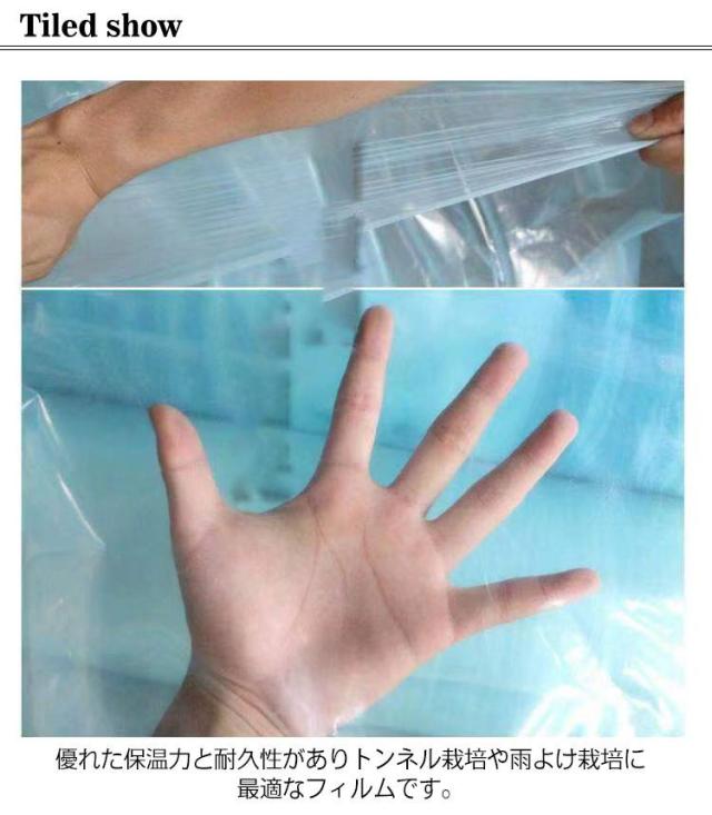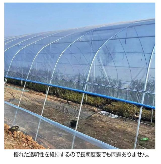 | 農業用フィルム 厚さ0.14mm 全長10m 幅6m 優れた保温力と耐久性がありトンネル栽培や雨よけ栽培に最適なフィルムです。 高い強度と透明性。流滴性に優れ、光を良く通します。 優れた透明性を維持するので長期展張でも問題ありません。 | |