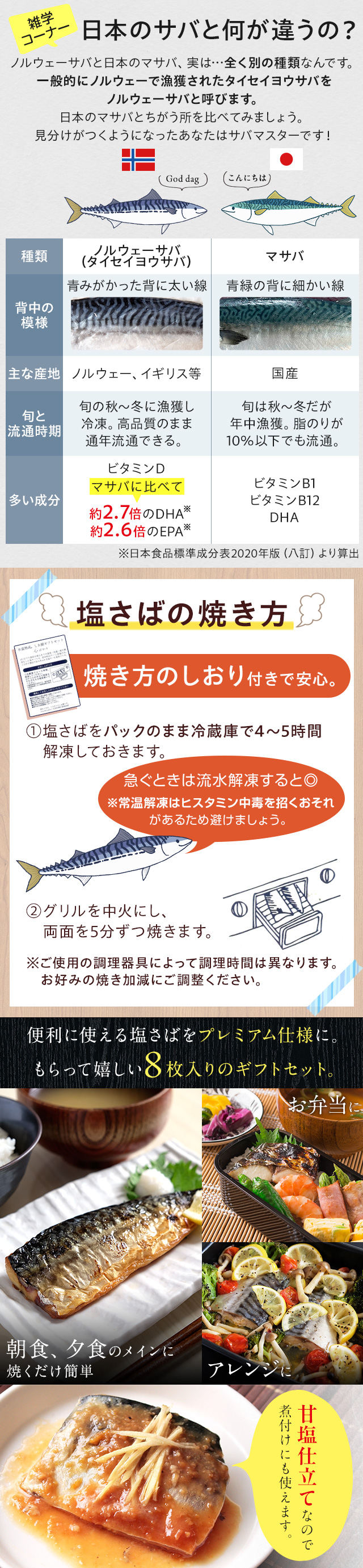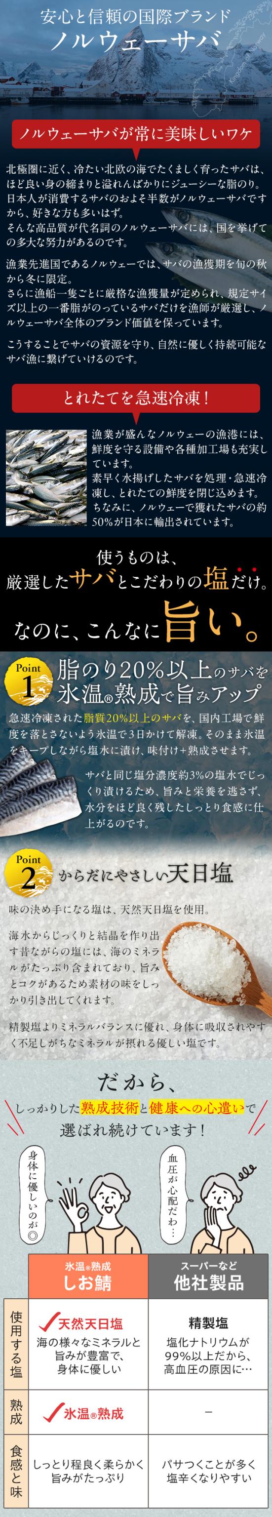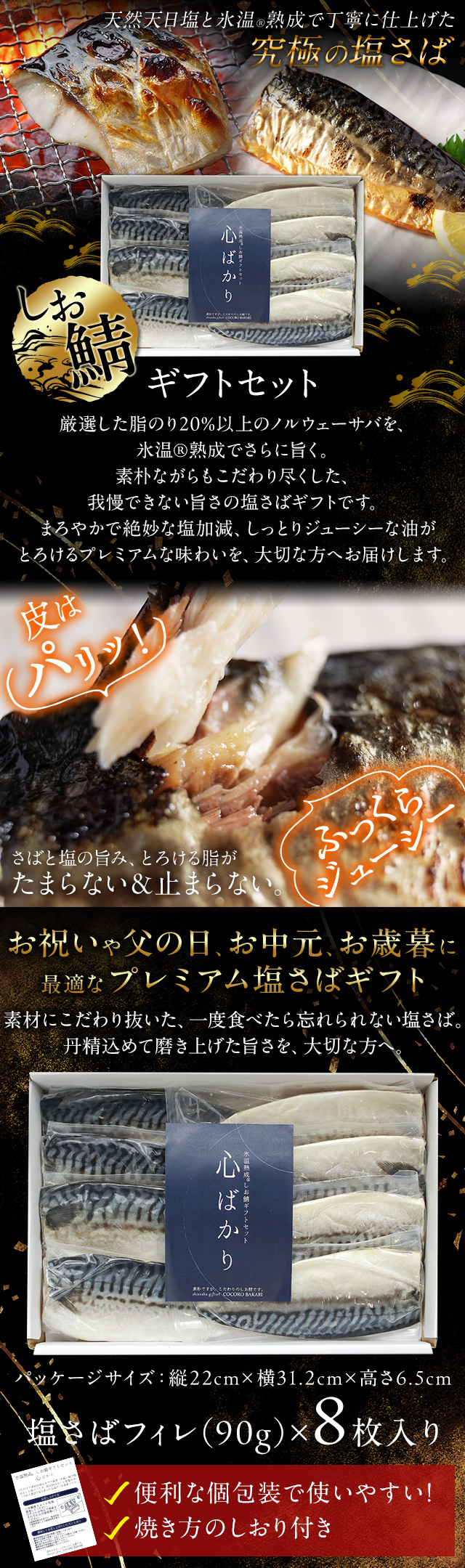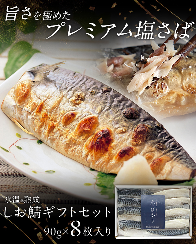 氷温熟成とこだわりの天然天日塩でノルウェーサバの旨みを閉じ込めた、プレミアムな味わいの塩さば。皮はパリッと、身はしっとりふっくら、あふれ出す脂がたまらない逸品。父の日やお歳暮など贈り物にも喜ばれる特別なギフトセットです。