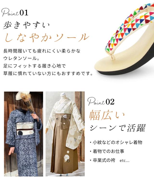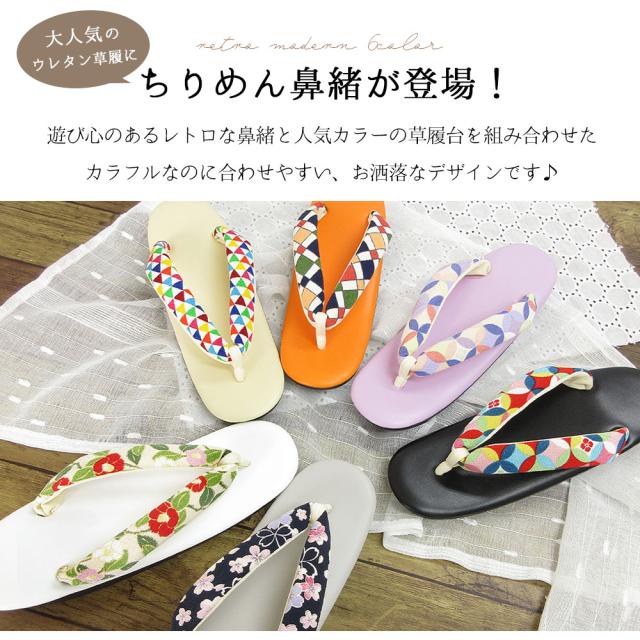 草履 ウレタン草履 レトロ ちりめん 鼻緒 痛くない やわらかい 疲れにくい ソフト鼻緒 お洒落 袴 モダン ウレタン レディース / M L LL サイズ フリーサイズ 小さいサイズ 大きいサイズ カラフル 伝統 古典 幾何学模様 椿 桜 七宝 鱗 / 卒業式 和装 小紋 雨