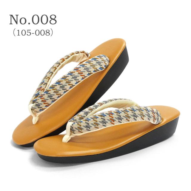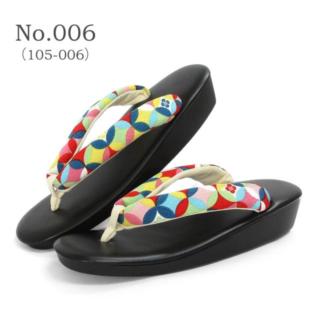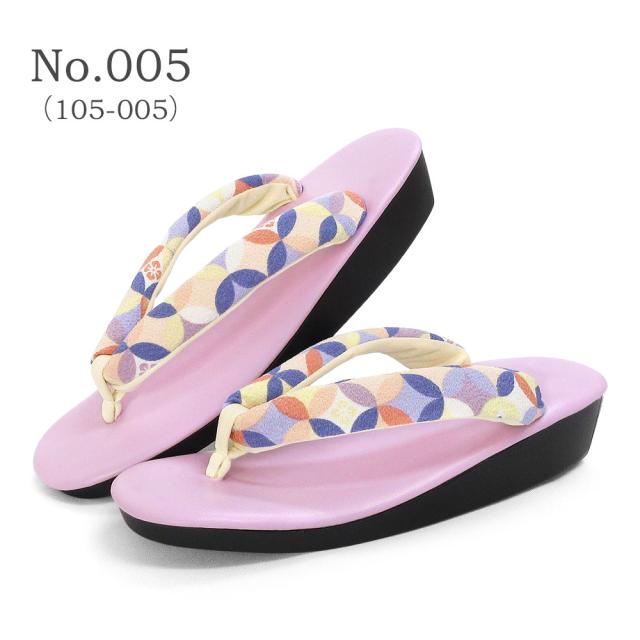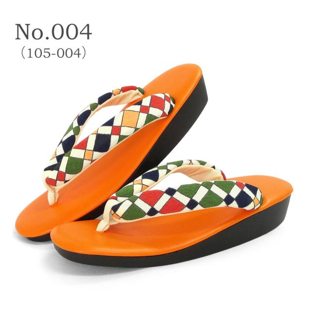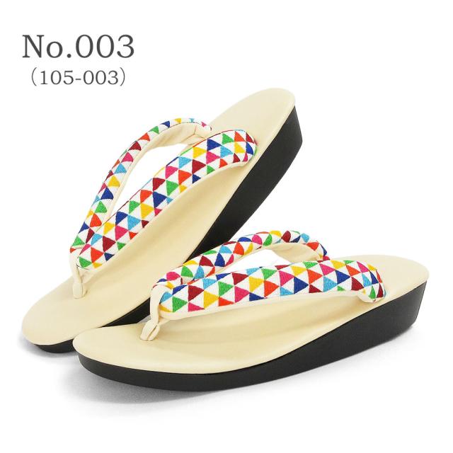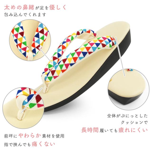遊び心のあるレトロな柄のちりめん鼻緒に人気カラーの草履台を組み合わせる事でカラフルなのに合わせやすい、お洒落なデザインに仕上がりました。