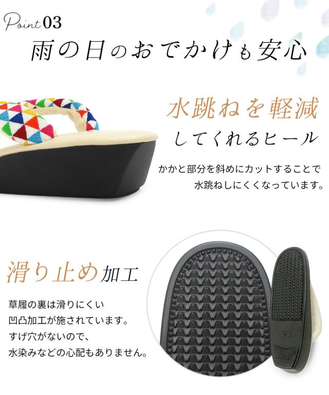 草履の裏面は滑りにくい凹凸加工が施されており、お天気のすぐれない日でもお着物を楽しんでいただける、頼もしい一足となっております。