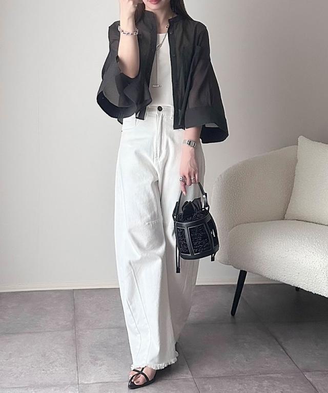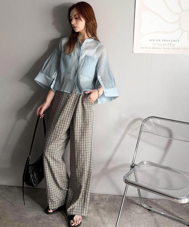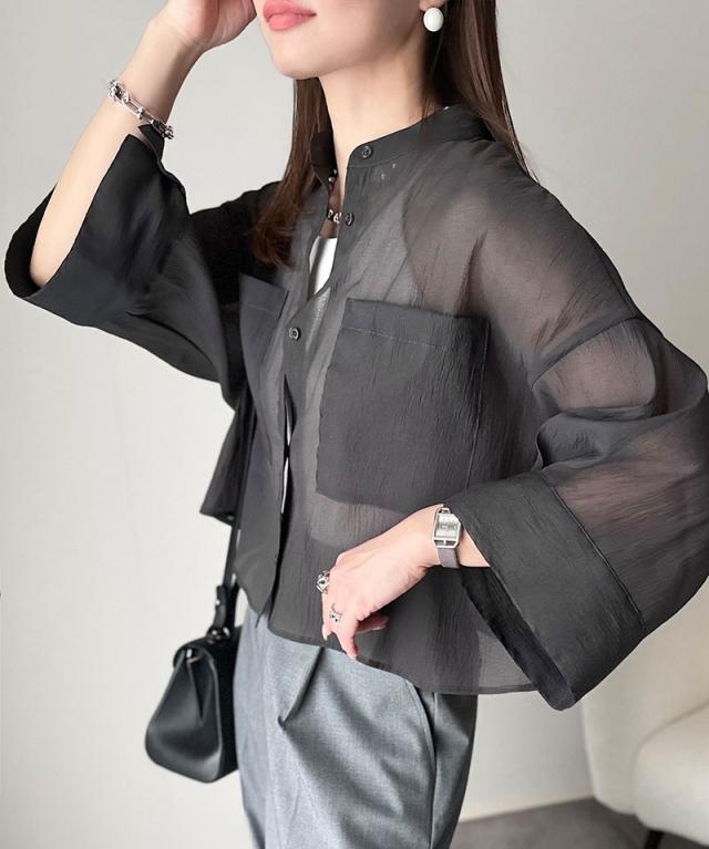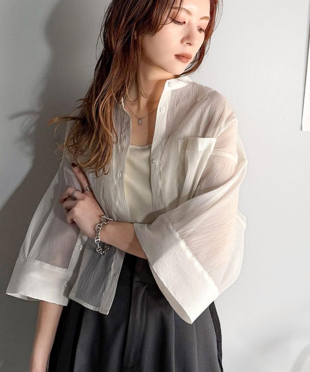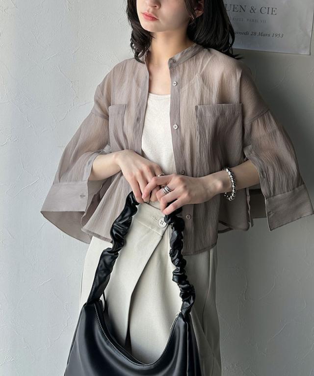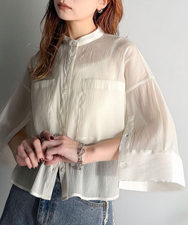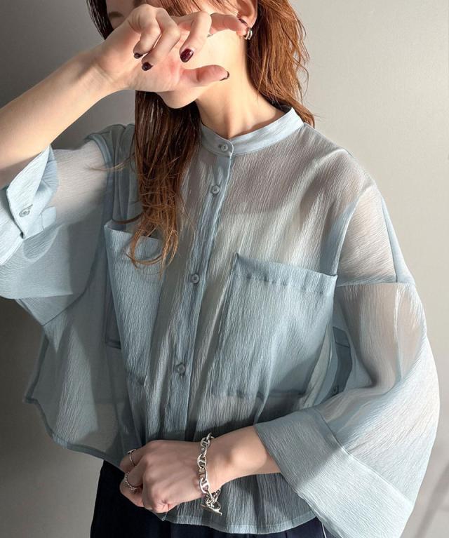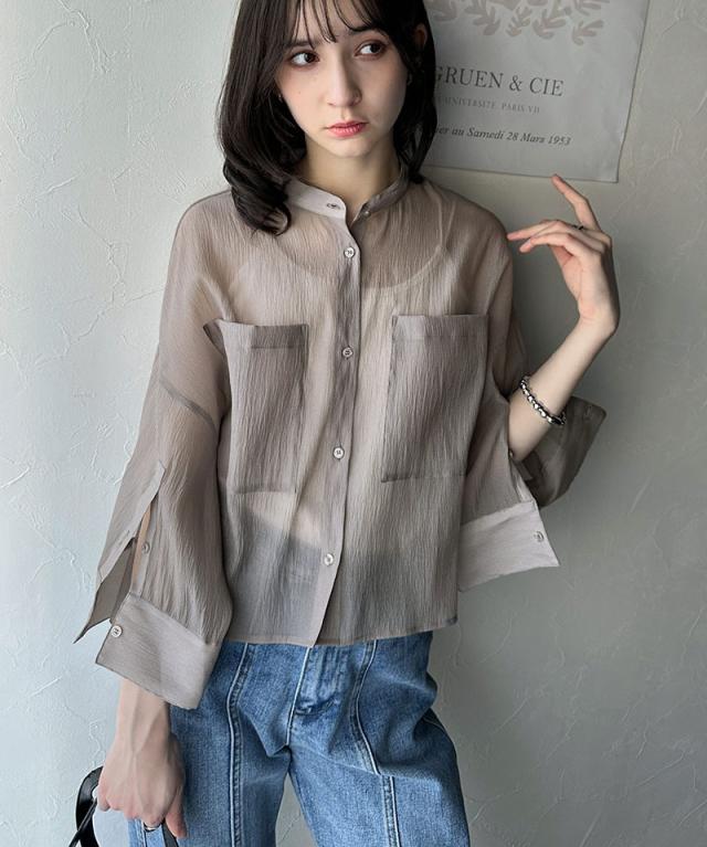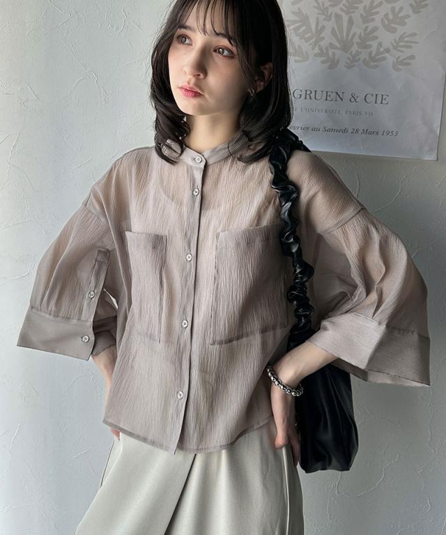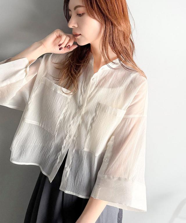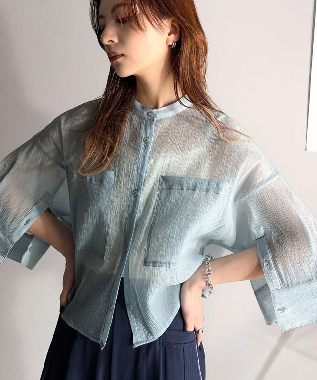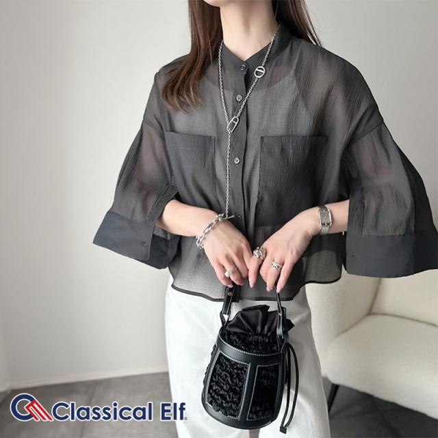 クラシカルエルフ秋新作 レディース トップス シャツ/ブラウス シアーバンドカラー ショートシャツ 半袖 ワイドスリーブ ダブルポケット 透け感 シアーシャツ オーバーサイズ こなれ感 冷房対策 トレンド 2025ss ce1110098