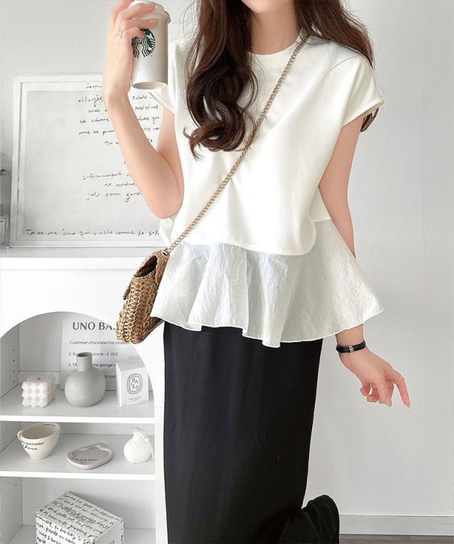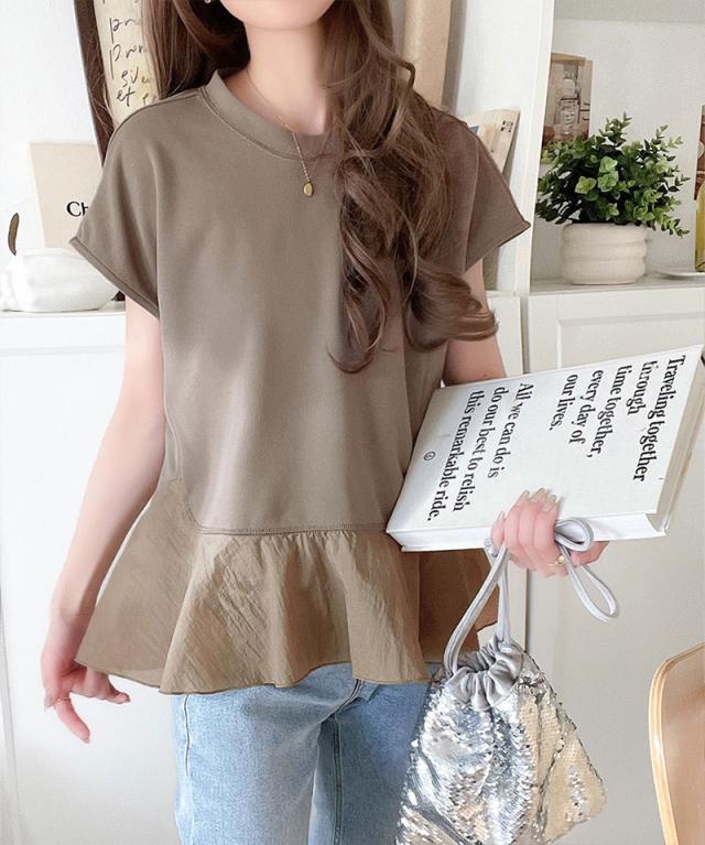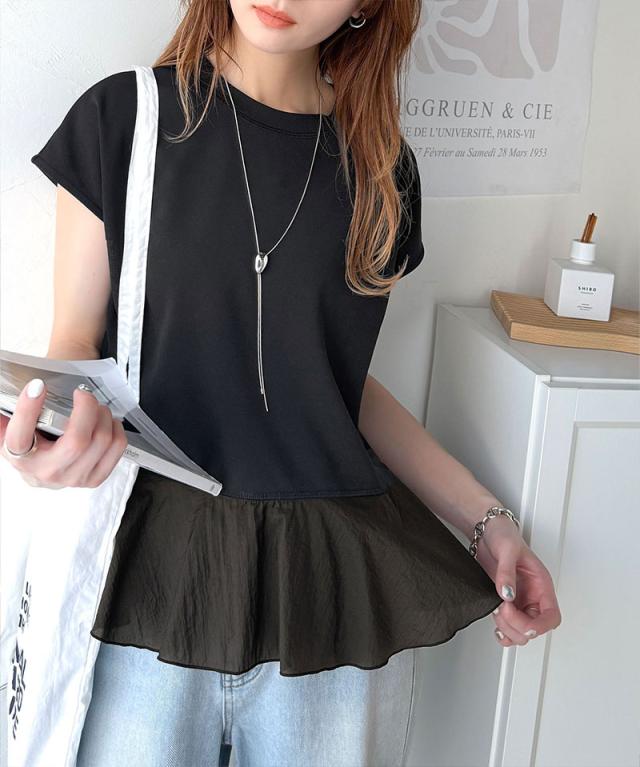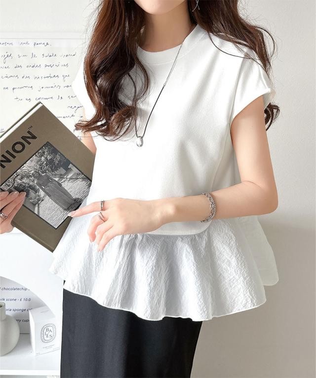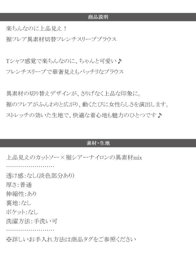 クラシカルエルフ春新作 レディース トップス シャツ/ブラウス 裾フレア 異素材切替 フレンチスリーブブラウス 楽ちん 上品見え Tシャツ感覚 華奢見え 異素材デザイン 上品印象 女性らしさ ストレッチ生地 快適着心地 2026ss ce1110103