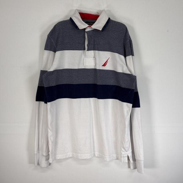 古着 ノーティカ NAUTICA 長袖 ポロシャツ 両面 ロゴ ボーダー ラガーシャツ風 エルボーパッチ S ホワイト系 マルチカラー メンズ