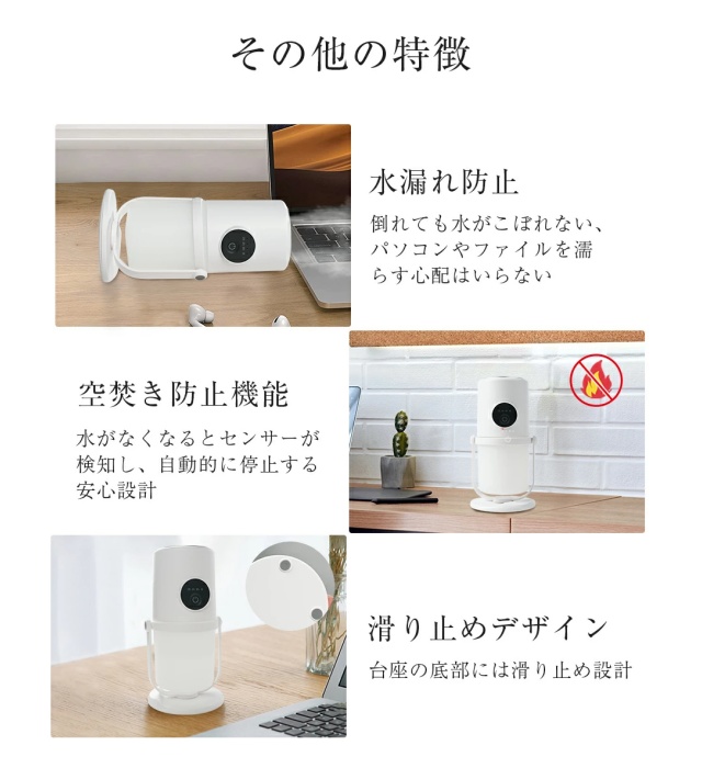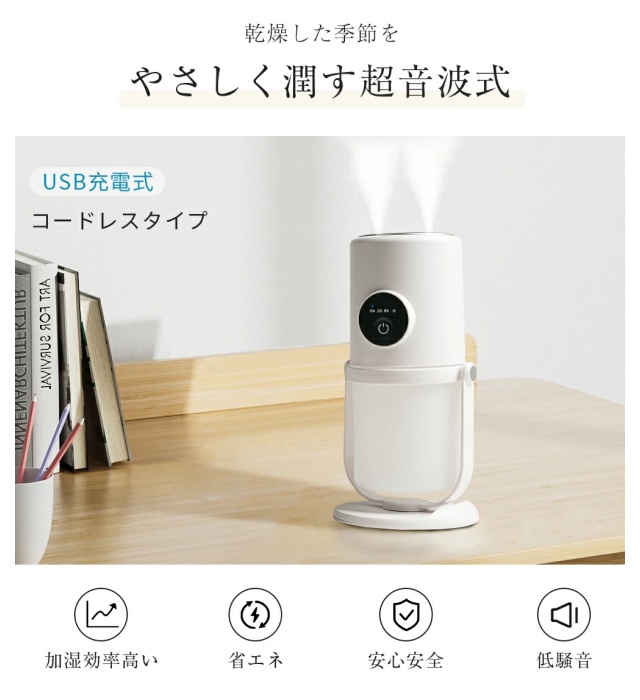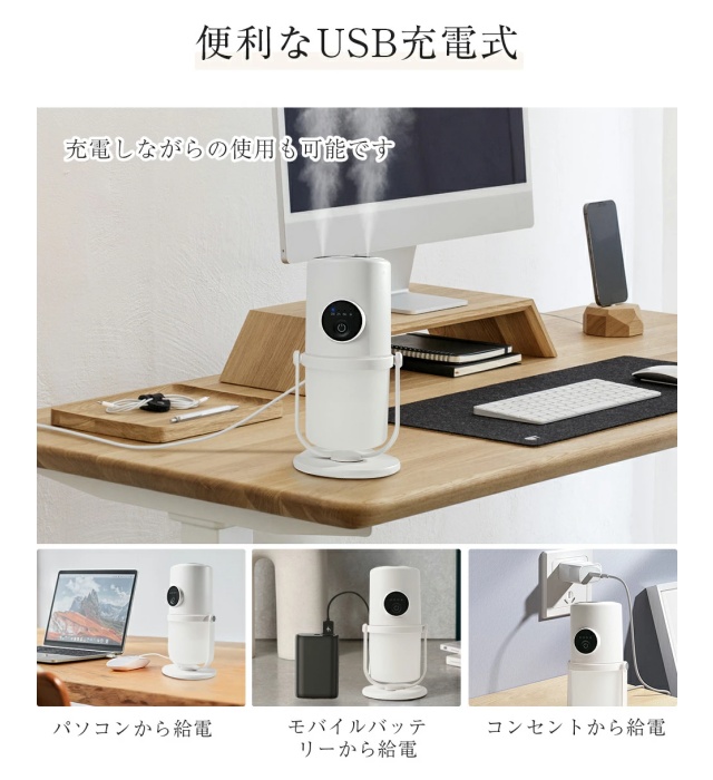 このUSB充電式小型加湿器は、USB給電に対応しており、アダプターのほかにパソコンやモバイルバッテリーからも給電が可能で、利便性が高いです。使用場所を変えたいときや、お掃除の際も片手で簡単に移動できます。