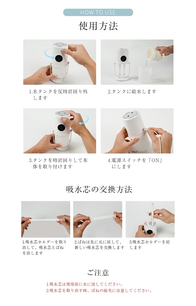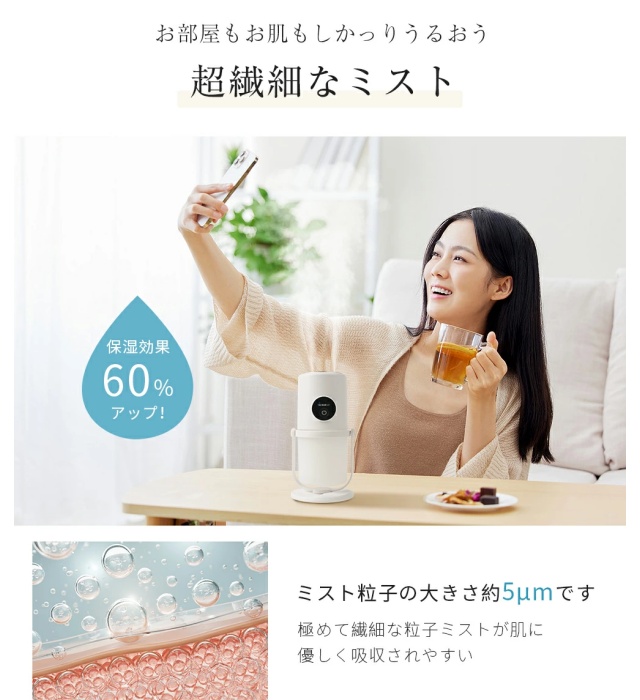 卓上加湿器は革新的なデザインでダブル吹き出し口を採用し、2つの噴霧口からパワフルに加湿します。霧化効果は従来の卓上加湿器の約2倍。お肌が喜ぶ超微細ミストを実現しました。卓上加湿器は高周波振動によりナノレベルの微粒子化を行い、肌の奥まで浸透する水分子を生成します。
