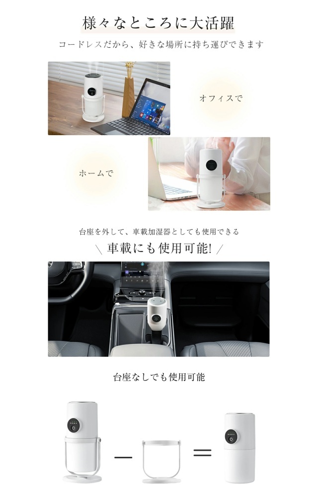 取り外し可能な台座を外せば、車載加湿器としても使用可能です。車内の空気を清浄し、静電気の発生を防ぎ、埃の飛散を抑えることで、鼻や喉の乾燥を防ぎます。出張や旅行に最適な車載加湿器です。