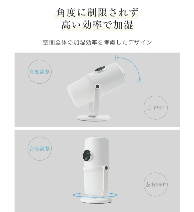 卓上加湿器のノズルは上下90度調整でき、さまざまな方向に噴霧を送ることができます。台座は360度回転可能で、部屋のレイアウトや使用シーンに合わせて最適な角度に設定できます。自分好みに角度を調整することで、心地よい湿度を自在に楽しみ、快適なうるおいライフを実現します。