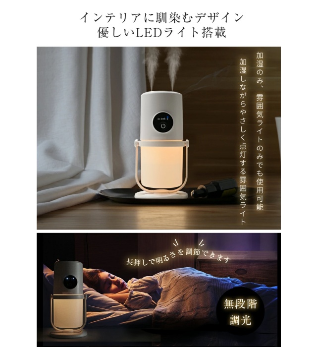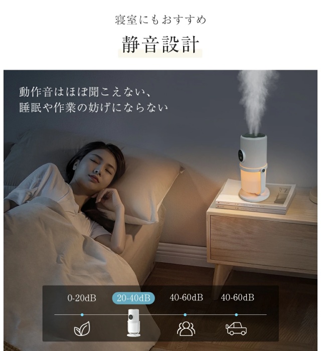 電源ボタンを素早く2回押すと、LEDライトのオン/オフができます。温かみのある暖色の光は寝室に安心感をもたらします。卓上加湿器は約30dBで動作し、とても静か。寝室の湿度を保ちながら、快適な眠りを妨げることはありません。