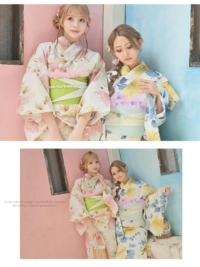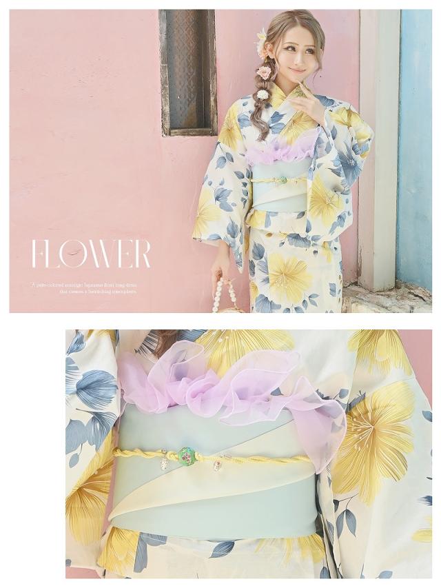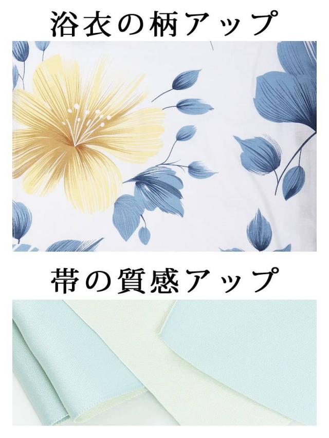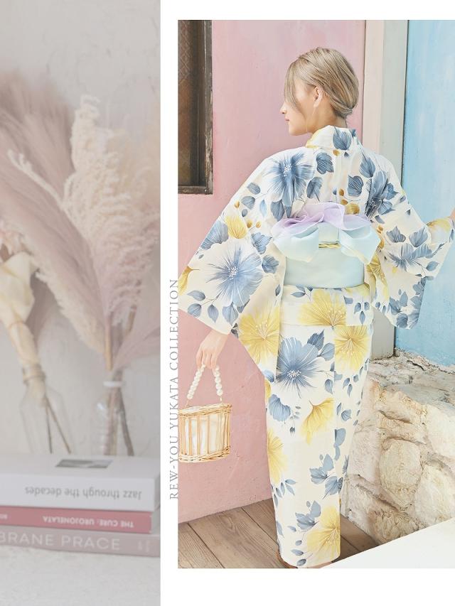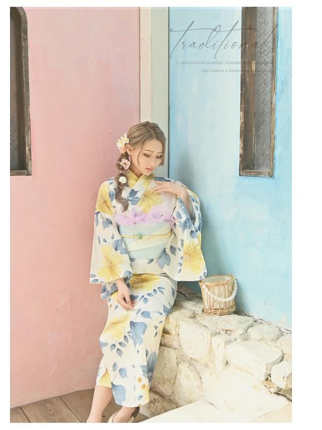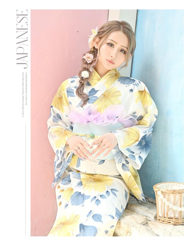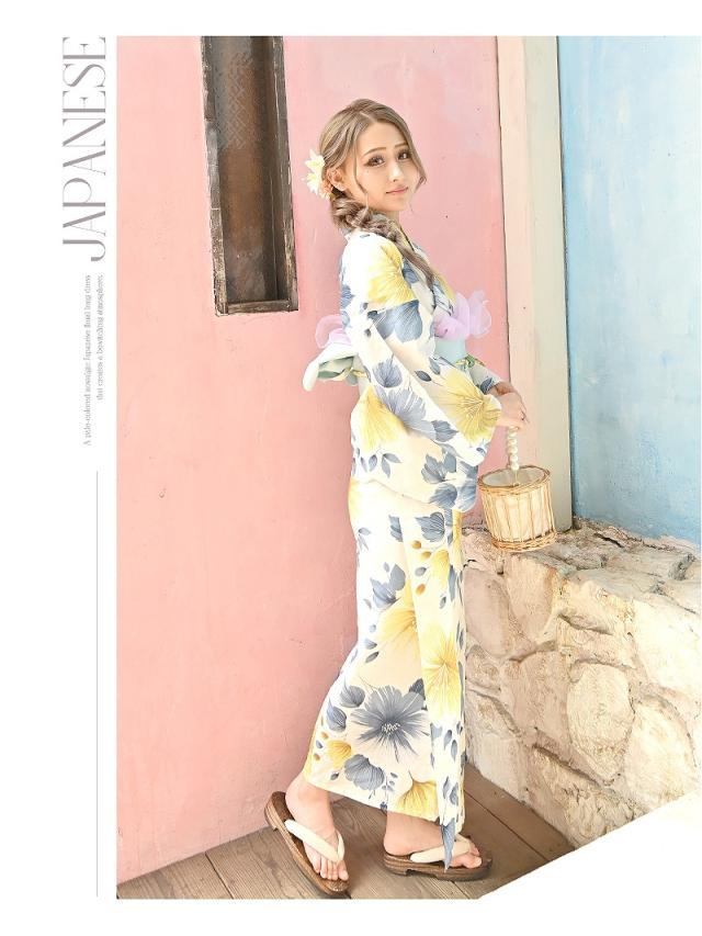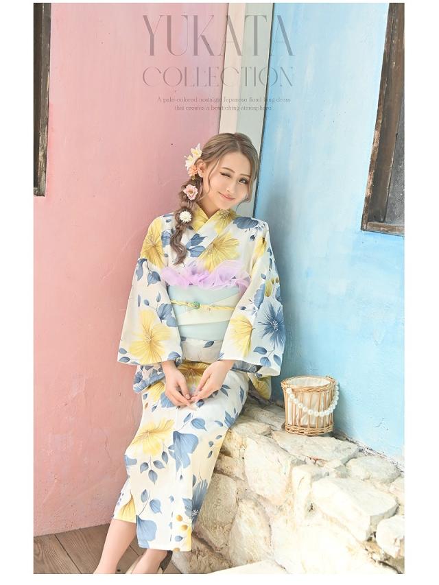 ☆目を惹く黄色と青の花柄が大人かわいいレディース浴衣。