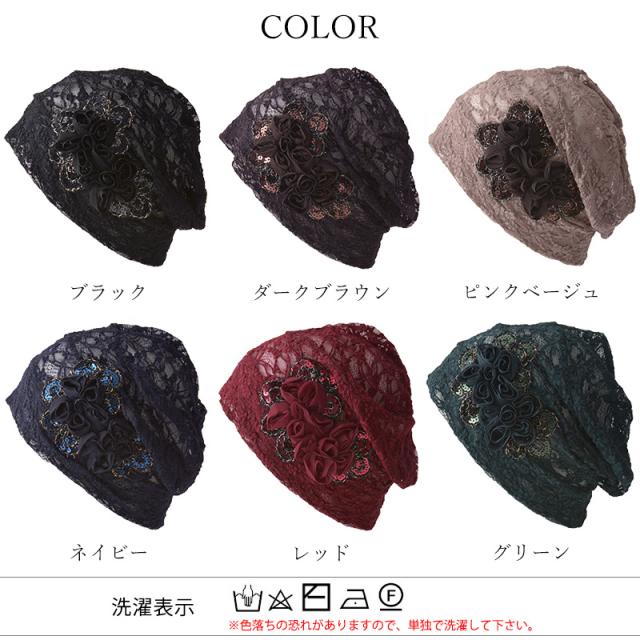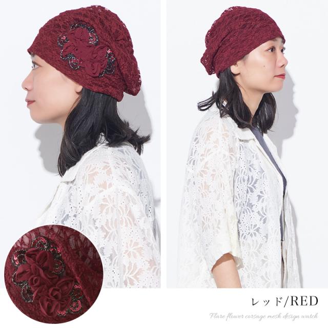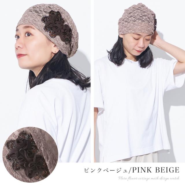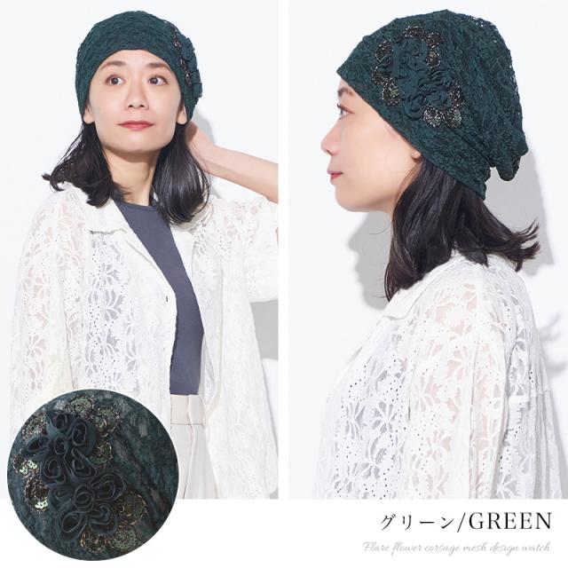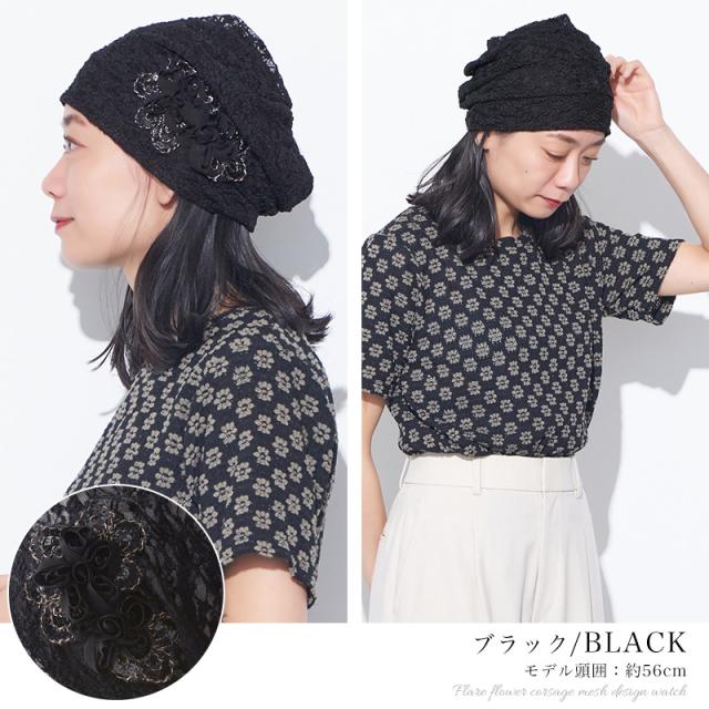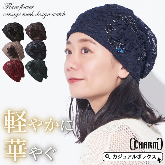 レディース オールシーズン 春 夏 春夏 春用 夏用 ポリエステル スパンデックス 帽子 ニット帽 ニットキャップ ワッチキャップ サマーニット帽 医療用帽子 おしゃれ 可愛い | CHARM Flare フラワー コサージュ メッシュ デザインワッチ be-fla
