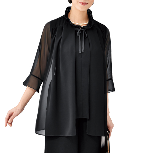 喪服 礼服 礼装 チュニック シースルー 五分袖 ブラックフォーマル レディース 日本製 フォーマルシフォンチュニック 婦人服 ミセス シニア 女性 ブラック 黒 フォーマル 上品 シンプル フリル襟 リボン 体型カバー 50代 60代 70代 80代 母の日 お母さん dz p27176