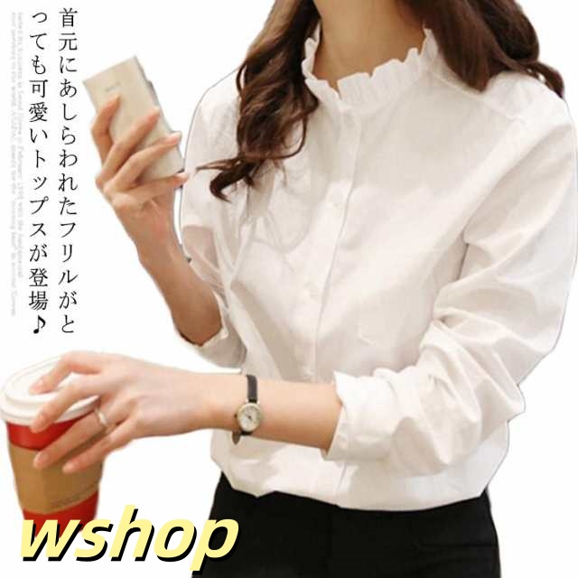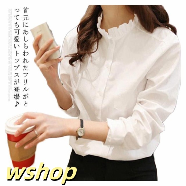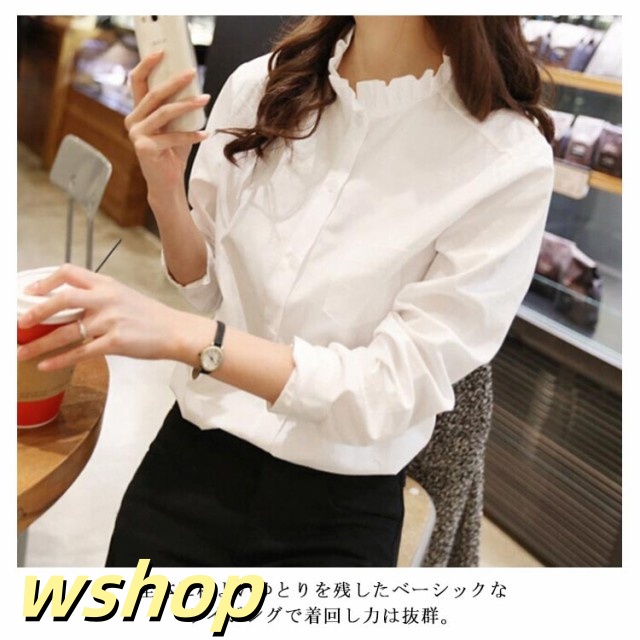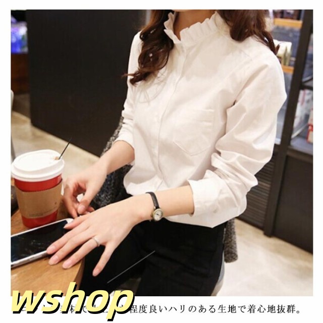 白シャツ フリル襟 シャツ ブラウス レディース ハイネックブラウス ハイネックシャツ フリルシャツ 白 長袖 トップス 無地 可愛い 綿 コットン 春服 秋服