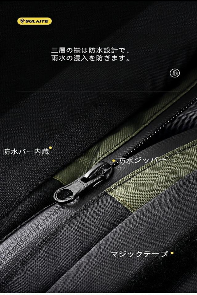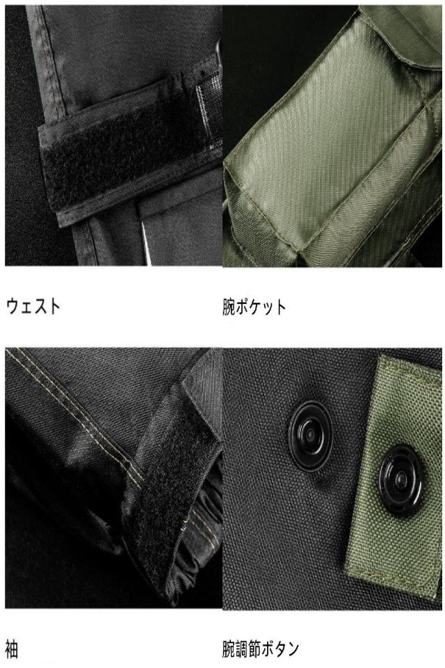 【耐水/防水性能】前面のファスナー部分は、ファスナーとボタンで閉じる三重構造。袖先部分はゴムギャザー加工で二重になっており、雨風の侵入を防ぎながら、袖が捲くり上がるのを防ぎます。上着両サイドのポケットは蓋付きで雨の侵入を防ぎます。