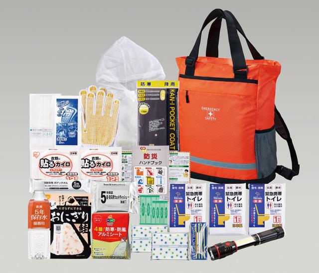 セット内容:避難用2WAYリュック、COB伸縮2WAYライト、ホイッスル、ウェットティッシュ(20枚)、軍手、使い捨てカイロ×2、防寒アルミシート、レインコート、携帯トイレ(大小兼用)1P×3、ポケットティッシュ×2、エイトバン(大小×各2)、防災ハンドブック、長期保存ボディタオル、熱冷却シート(2枚入)、携帯おにぎり(鮭)、備蓄用飲料水500?、マスク