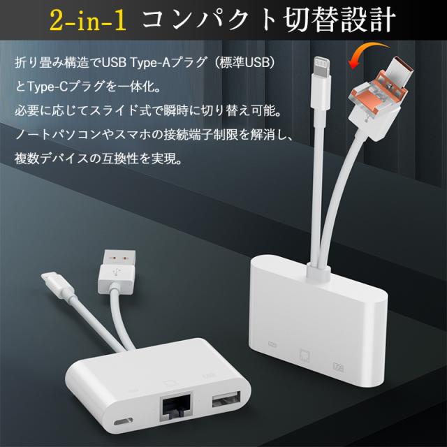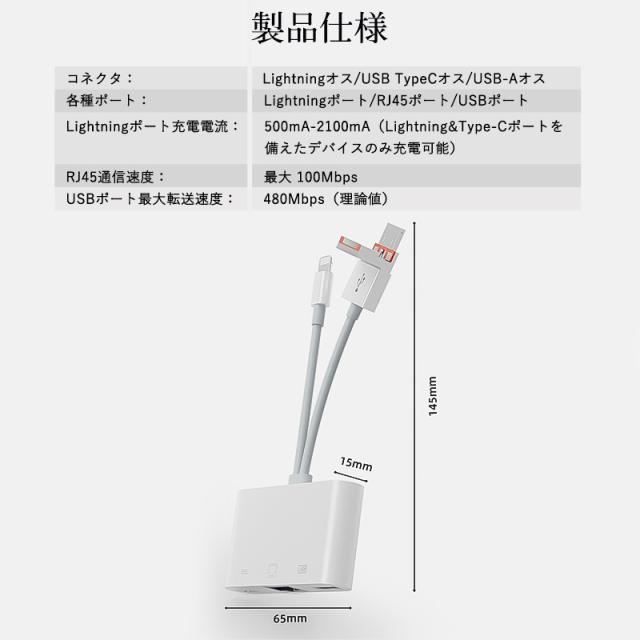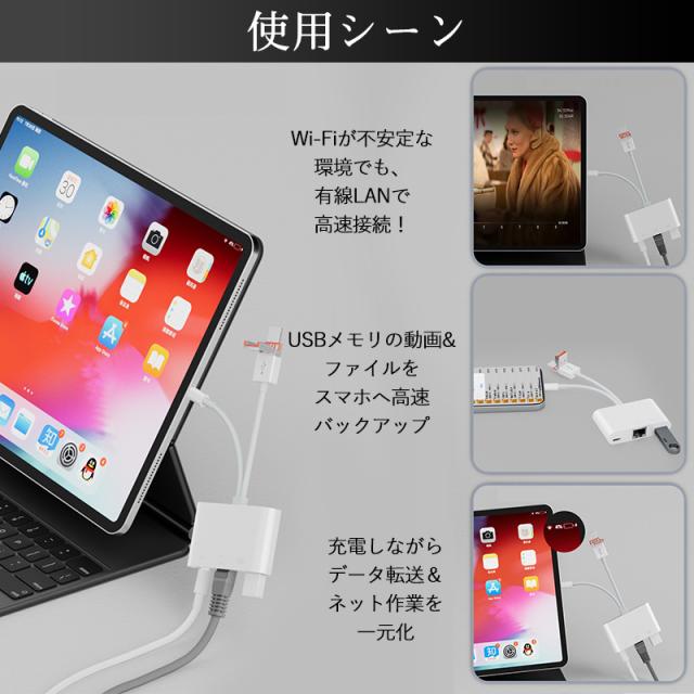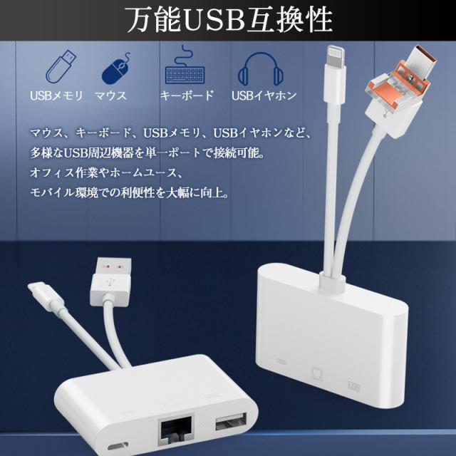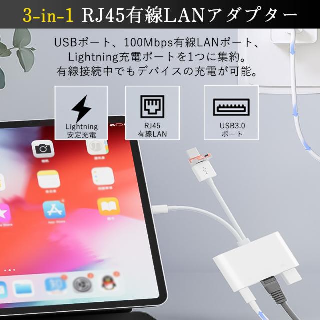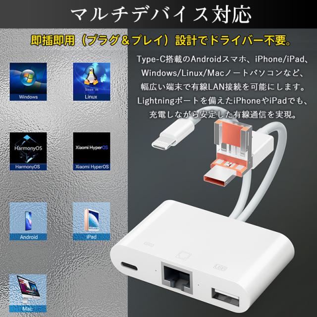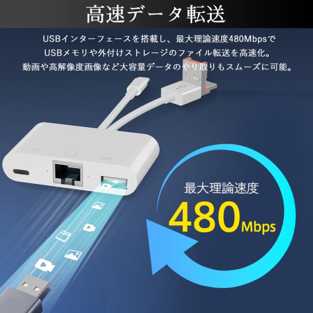 3in1 有線LAN アダプター iPhone Android LANケーブル iPhone15 16 接続 Type-C タイプC ライトニング 変換 データ 通信 マンション アパート 病院 アイフォン USB LAN 変換アダプター USB3.0 RJ45 10/100Mbps 3ポート イーサネット Type-A 有線ランアダプター usbハブ switch 対応 Lightning カメラ/ビデオ転送 同時充電
